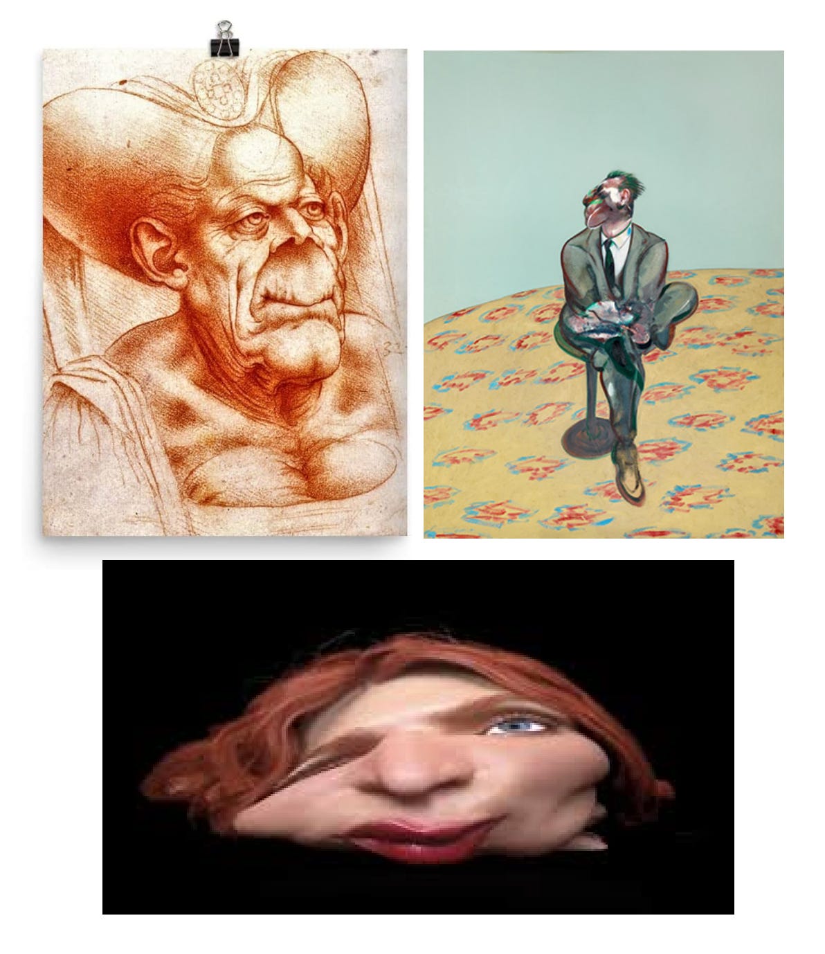 You might think of the Distorted Face đ«Ș as a modern invention but weâve been manipulating our faces with this kind of tension for centuries. From Da Vinciâs 15th-century grotesques to Francis Bacon (âIf you want to convey fact and if you have to do it, then this can only ever be done through a form of distortionâ1) this technique is used to express a great deal of feeling beyond what the muscles in our faces are literally able to flex.